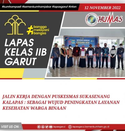 PURNAYUDHA.COM – Lembaga Pemasyarakatan Kelas IIB Garut menjalin kerja sama dengan Puskesmas Sukasenang. Hal ini ditandai dengan penandatangan Perjanjian Kerja Sama antara Kalapas (Iwan Gunawan Wahyudi) dengan Kepala Puskesmas Sukasenang…