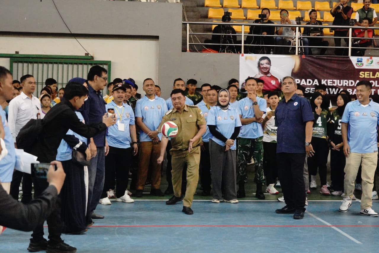 GARUT, PURNAYUDHA.COM – Bupati Garut sekaligus Ketua Persatuan Bola Voli Seluruh Indonesia (PBVSI) Kabupaten Garut, Abdusy Syakur Amin, secara resmi membuka Kejuaraan Daerah (Kejurda) Voli U-18 Antar Klub se-Jawa Barat di GOR Cikuray, Komplek SOR RAA Adiwijaya, Jalan Proklamasi, Kecamatan Tarogong Kidul, Kabupaten Garut, Senin (13/4/2026). Tercatat sebanyak 56 klub yang berasal dari 14 kabupaten/kota di Jawa Barat turut ambil bagian dalam kompetisi ini.