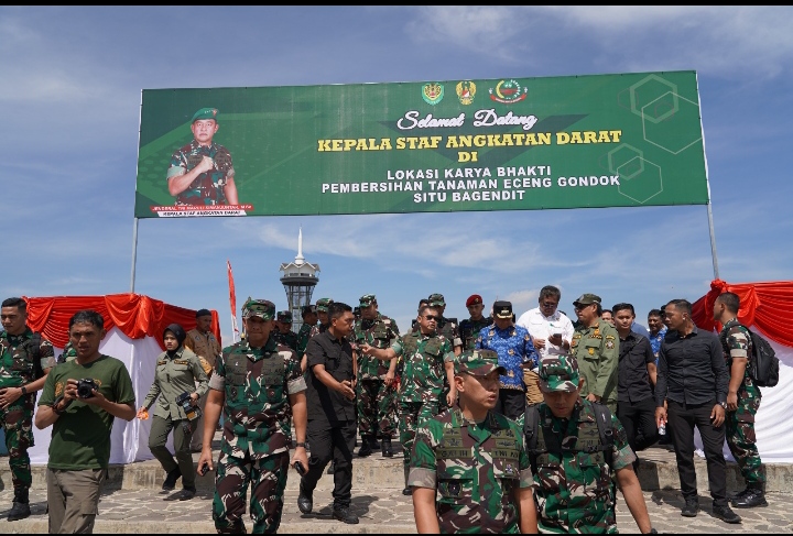 PURNAYUDHA.COM – Komandan Korem 062/Tn Kolonel Inf Nurul Yakin, M.A., mendampingi Pangdam III/Slw Mayjen TNI Dadang Arif Abdurahman S.E.,M. Si.,S.E., M.SI.,CHRMP., menyambut kunjungan kerja Kepala Staf Angkatan Darat Jendral TNI Maruli Simanjuntak, M.Sc., meninjau langsung kegiatan Karya Bakti Pembersihan Tanaman Eceng Gondok di kawasan objek wisata Situ Bagendit Kp Kiaralawang Ds. Sukamukti Kec. Banyuresmi Kab. Garut, Kamis (17/07/2025).