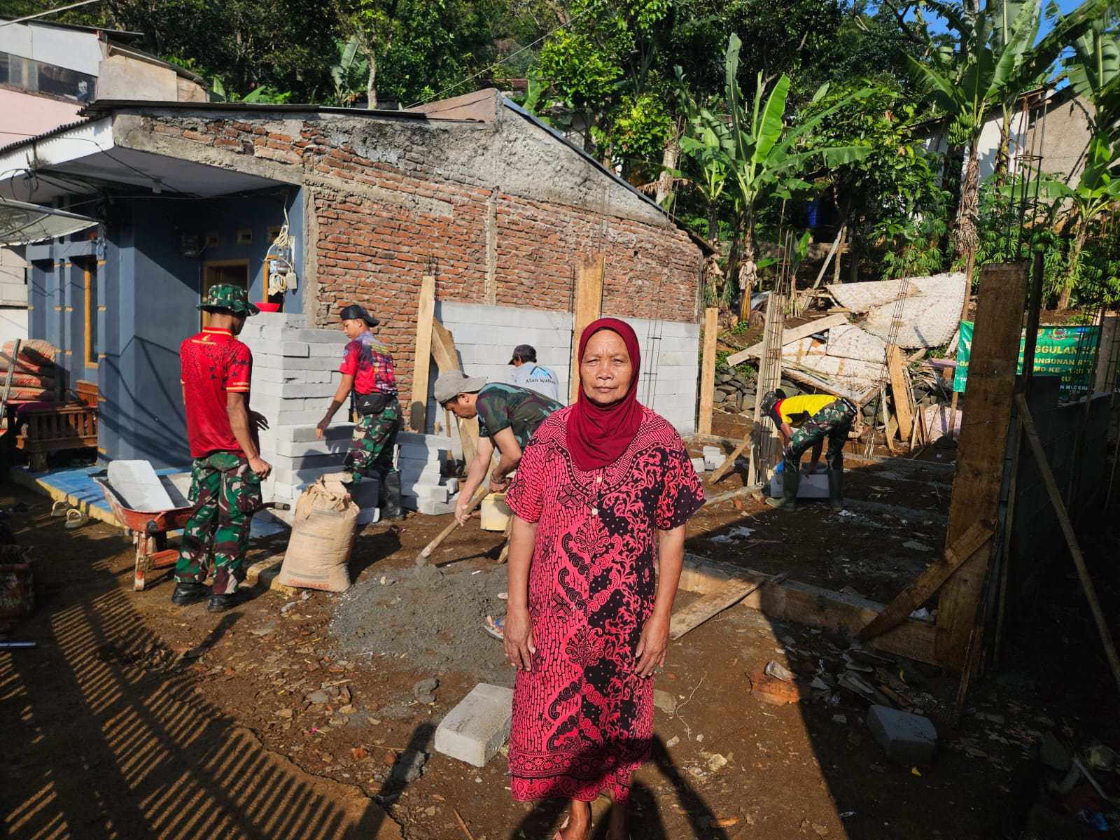 Terlihat Personel Satgas TMMD ke 128 Kodim 0611/Garut pun berjibaku merenovasi rumah Ibu Anah, hal tersebut sebagai bukti wujud hadirnya TNI di tengah masyarakat pada program TNI Manunggal Membangun Desa (TMMD).