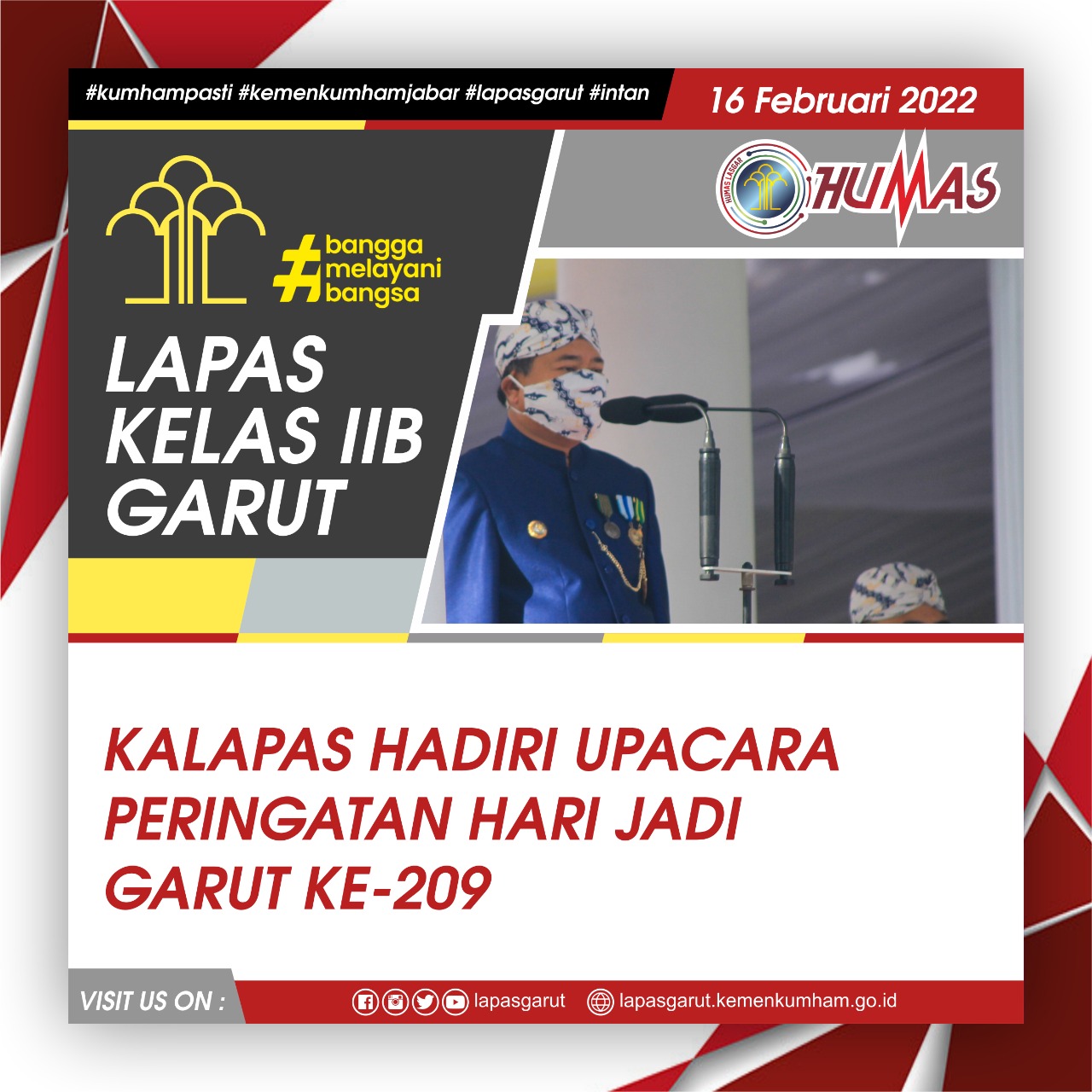 PURNAYUDHA.COM – Rabu, 16 Februari 2022 – Kalapas Garut (Iwan Gunawan Wahyudi) menghadiri Upacara Peringatan Hari Jadi Garut Ke – 209 Tahun 2022. Upacara dihadiri oleh Forkopimda, Tokoh Masyarakat serta Aparatur Sipil Negara, bertempat di Lapangan Alun – Alun Kabupaten Garut.