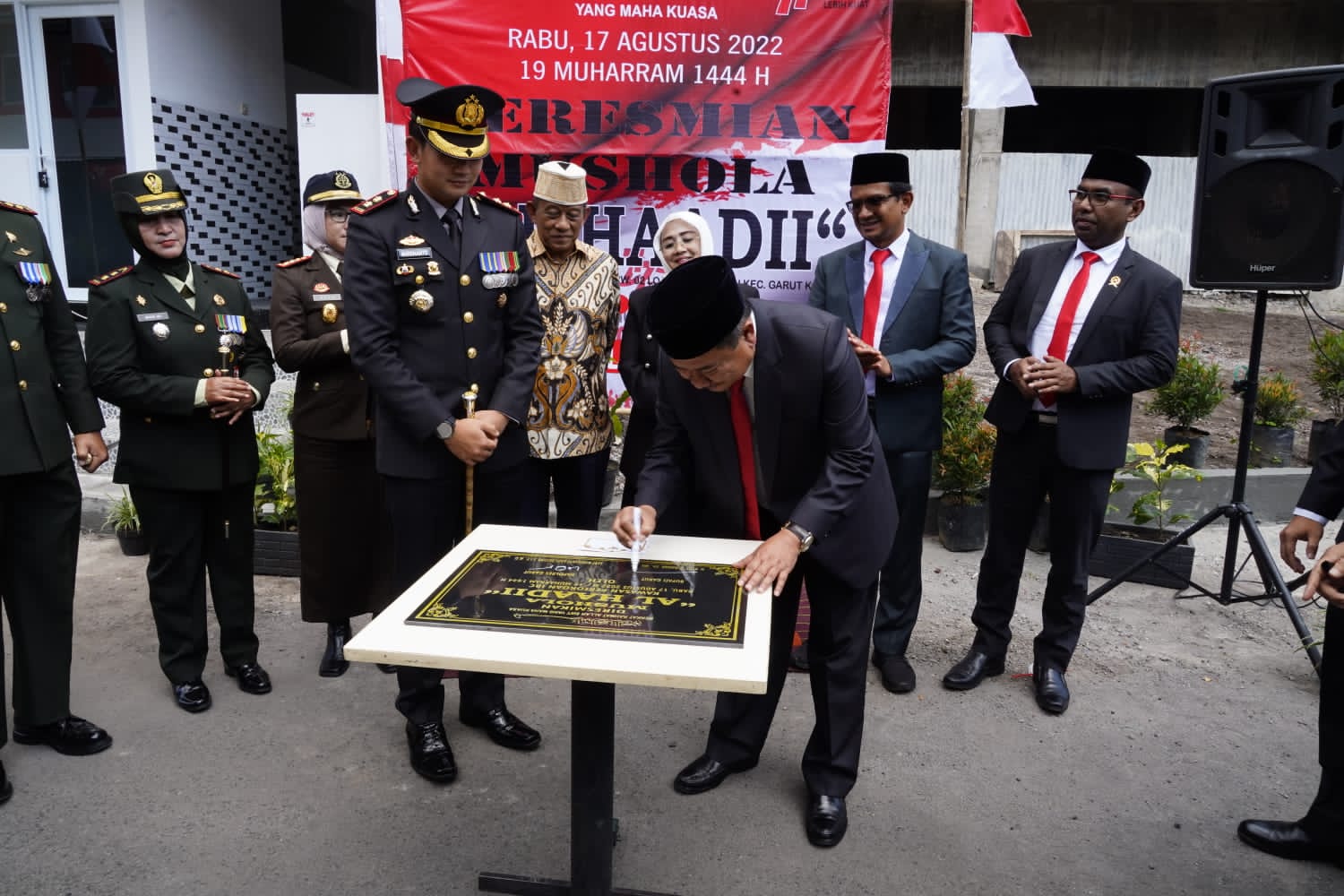 Peresmian mushola Al-Haadii ditandai dengan pengguntingan pita oleh sesepuh Abah Jendral (Purn) Deddy Fauzi Elhakim didampingi oleh Forkopimda Kabupaten Garut. Rabu 7. Agustus 2022