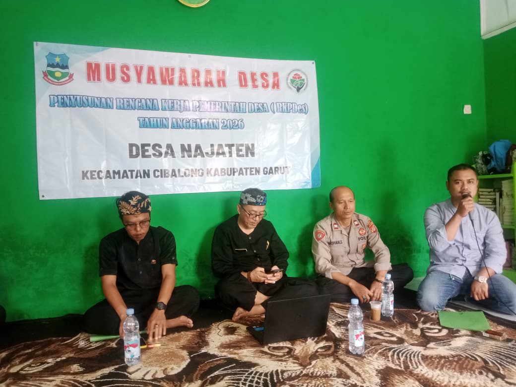 Purnayudha.Com,Garut-Musyawarah Desa penyusunan Rencana kerja pemerintah Desa ( RKPDes ) tahun Anggaran 2026 Desa Najaten Kecamatan Cibalong kab Garut . Musyawarah dilaksanakan di Di Aula  Madrasah yang  tidak jauh dari kantor Desa Najaten tepat  di kmp  Sodong RT 01 RW 01 Desa Najaten kecamatan Cibalong kab Garut, 31/07/2025.