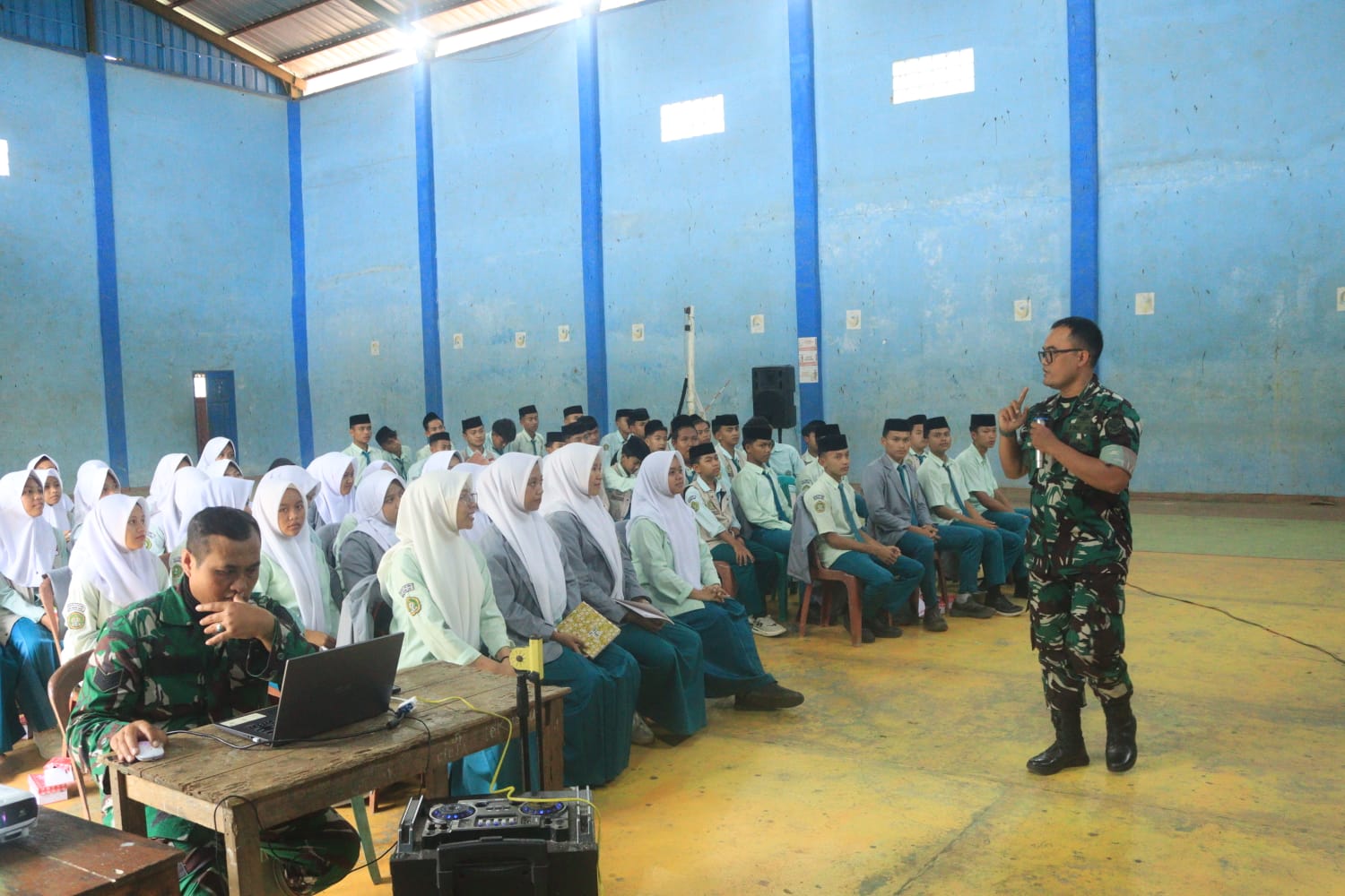 GARUT, PURNAYUDHA.COM – Memasuki hari ketujuh pelaksanaan TNI Manunggal Membangun Desa (TMMD) Reguler ke-128 Tahun Anggaran 2026 di wilayah Kodim 0611/Garut, rangkaian kegiatan non-fisik terus digalakkan. Kali ini, kegiatan diisi dengan penyampaian materi dan pelatihan Bela Negara yang dibawakan langsung oleh Komandan Rayon Militer 1103/Sucinaraja, Kapten Inf Supriatna. Kegiatan ini dihadiri oleh 60 orang peserta yang terdiri dari siswa-siswi MTs dan MA An-Nur serta anggota Karang Taruna setempat.
